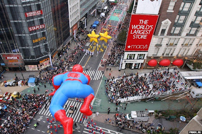 Nothing defines Thanksgiving like the Macy's Thanksgiving Day Parade. On November 26, 2009 at 9 a.m. the 83rd Annual Macy's Thanksgiving Day Parade began. The parade travels down Central Park West from 77th Street to Columbus Circle along Central Park South to 7th Avenue, down 7th Avenue to 42nd Street, along 42nd Street to 6th Avenue, down 6th Avenue to 34th Street and along 34th Street to Macy's Herald Square. Giant balloons, floats, marching bands and clowns with confetti brought smiles to thousands of revelers eager to catch a glimpse of a parade as steeped in Thanksgiving Day tradition as turkey and pumpkin pie. Thousands lined the streets of Manhattan for the 83rd annual Macy's Thanksgiving Day Parade, while crowds gathered nationwide for parades in cities such as Detroit and Philadelphia. The parade is a tradition of the Thanksgiving holiday that Americans usually celebrate by joining with family for a turkey lunch or dinner. The Macy’s Thanksgiving Day Parade in New York City is a remarkable event.